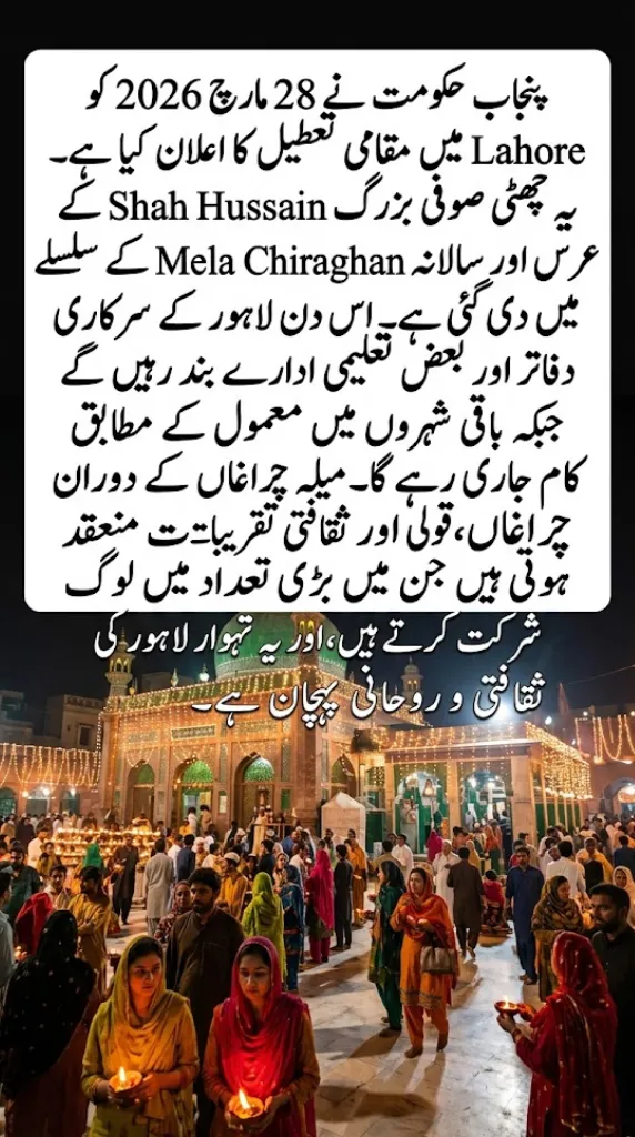 The Punjab Government’s decision to announce a local holiday on March 28, 2026, in Lahore highlights the importance of preserving cultural and spiritual traditions. The celebration of Mela Chiraghan is not just an event—it is a reflection of Punjab’s deep-rooted Sufi heritage.